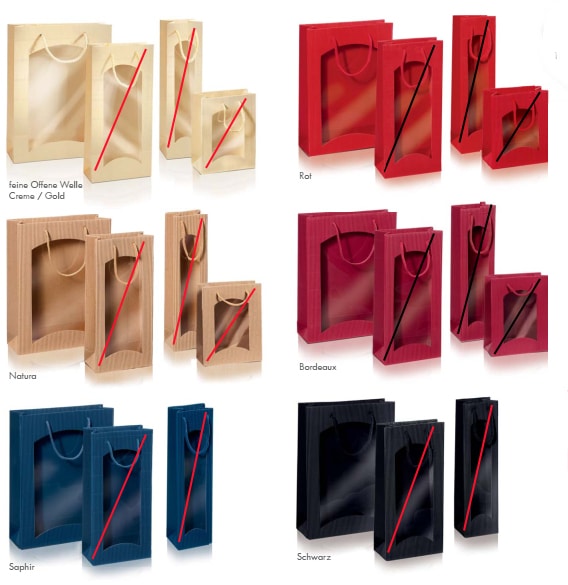 Praktische Tasche für viele Artikel geeignet. Das Sichtfenster gewährt dem Kunden bereits den Blick auf die Ware. Wird gerne als Flaschenverpackung (Wein, Likör, Öle etc.) verwendet. Alle Taschen mit farbigen Kordeln. Geeignet für max. 3x 0,75/1L Flaschen.