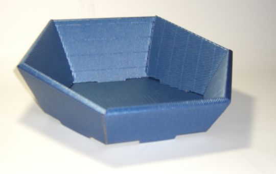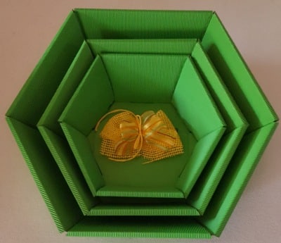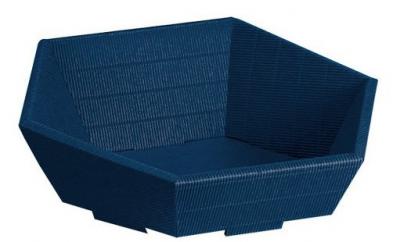Unterschiedlich gefärbter Geschenkkorb in sechseckiger Ausführung, nach hinten leicht ansteigend für eine optimale Produktpräsentation.